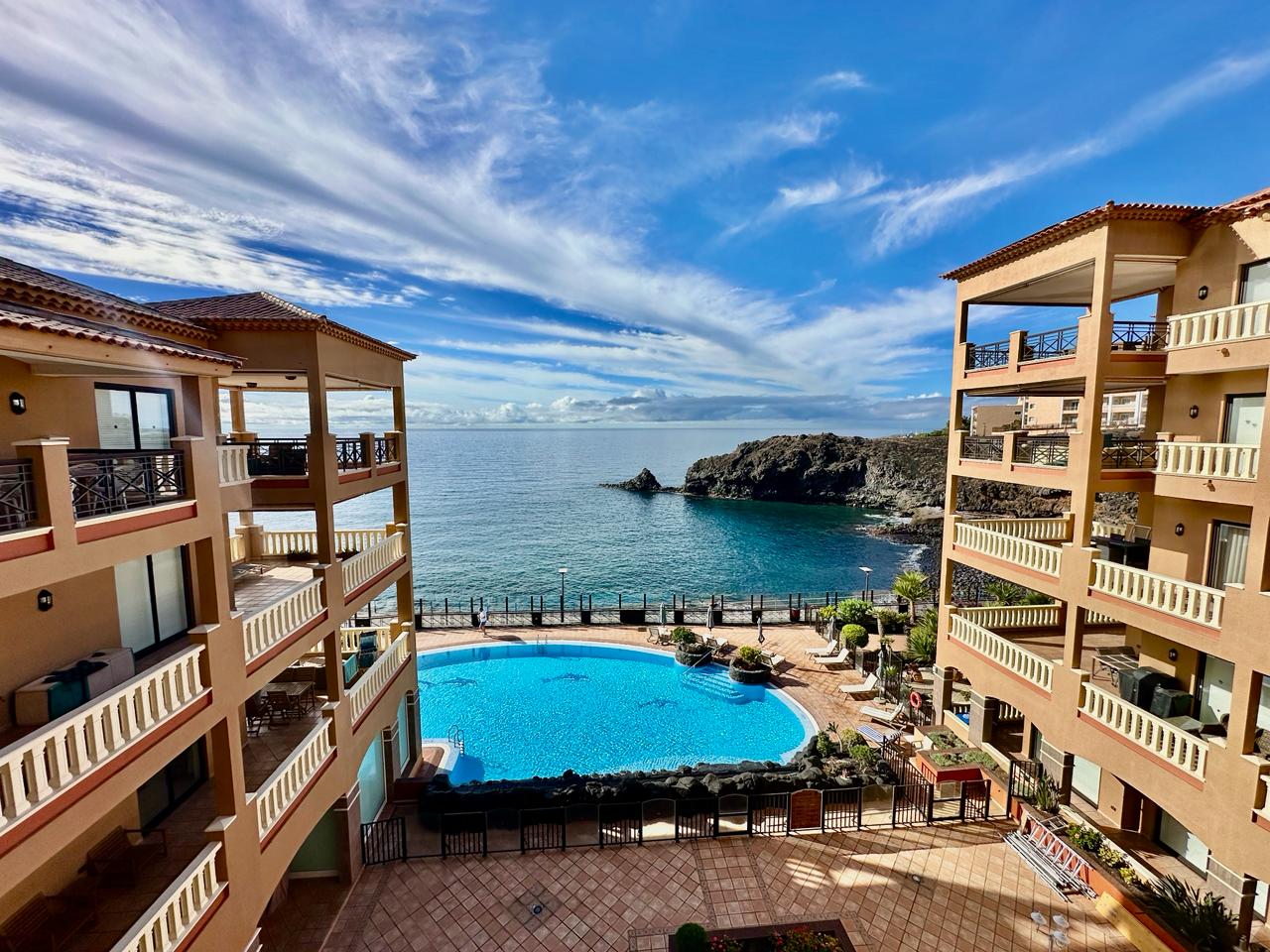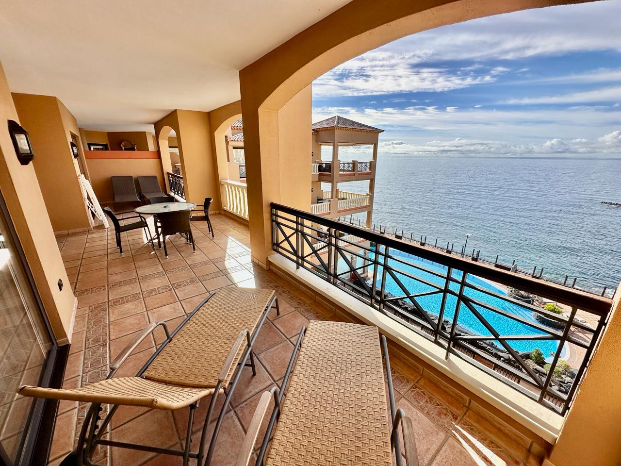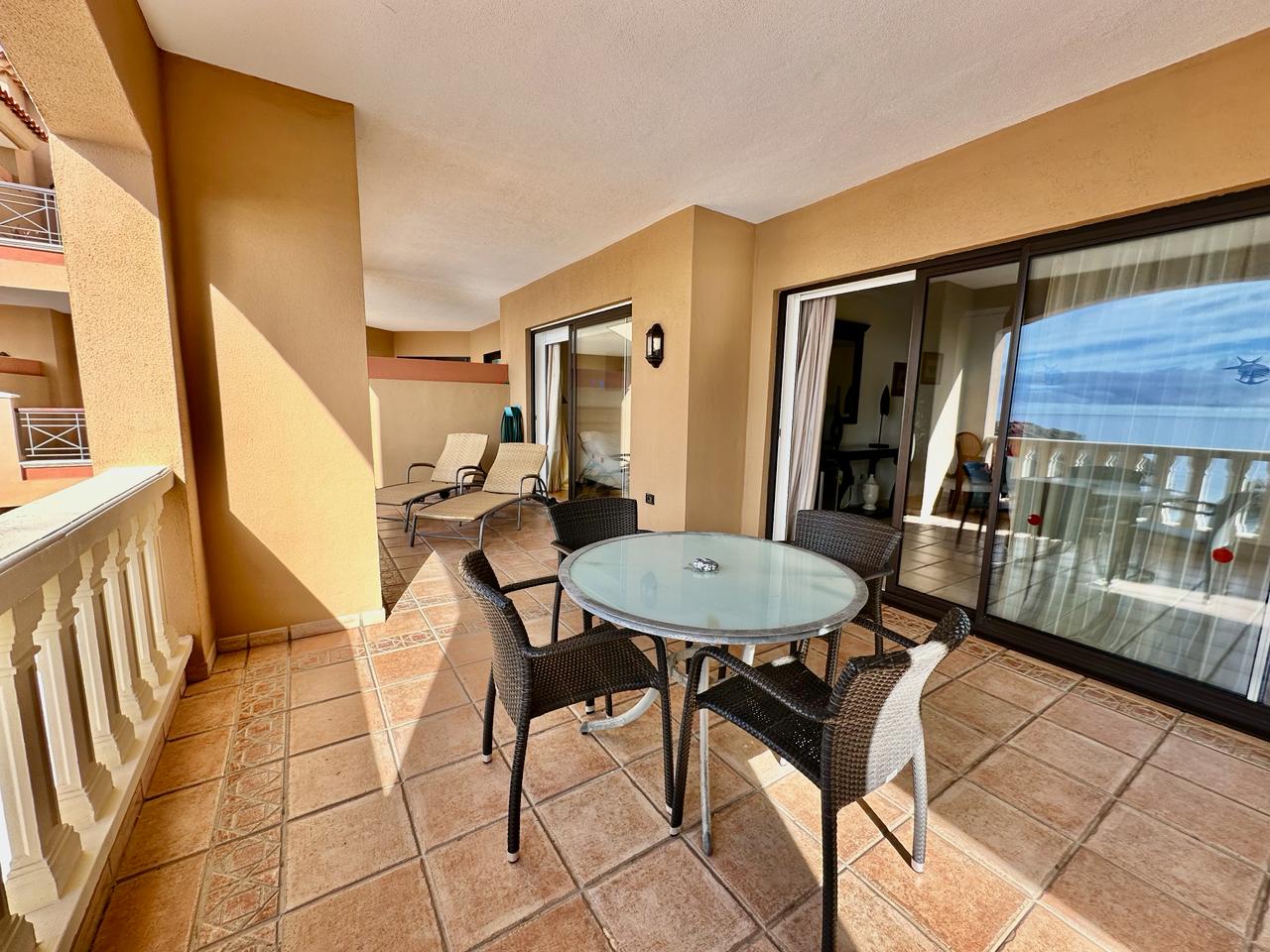 EL NAUTICO - GOLF DEL SUR. Magnificent fourth-floor apartment with spectacular sea views. It comprises two double bedrooms with fitted wardrobes, a master bedroom with en-suite bathroom, a fitted kitchen and a living room. All rooms have access to a 35 m² terrace with fantastic sea views. Sold furnished. Includes underground parking space and storage room. The complex has a reception, heated swimming pool and gym. Solar panels and upgraded Wi-Fi.