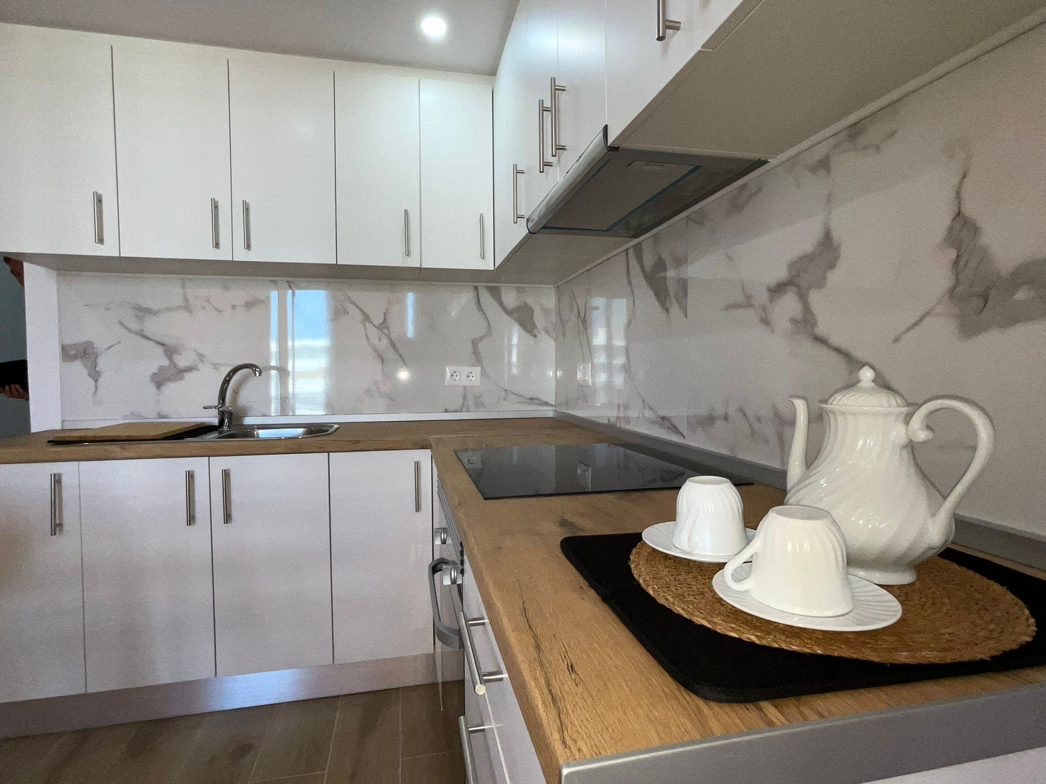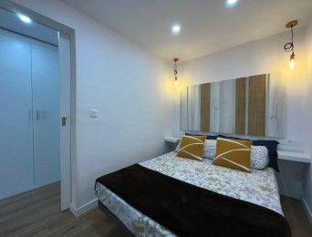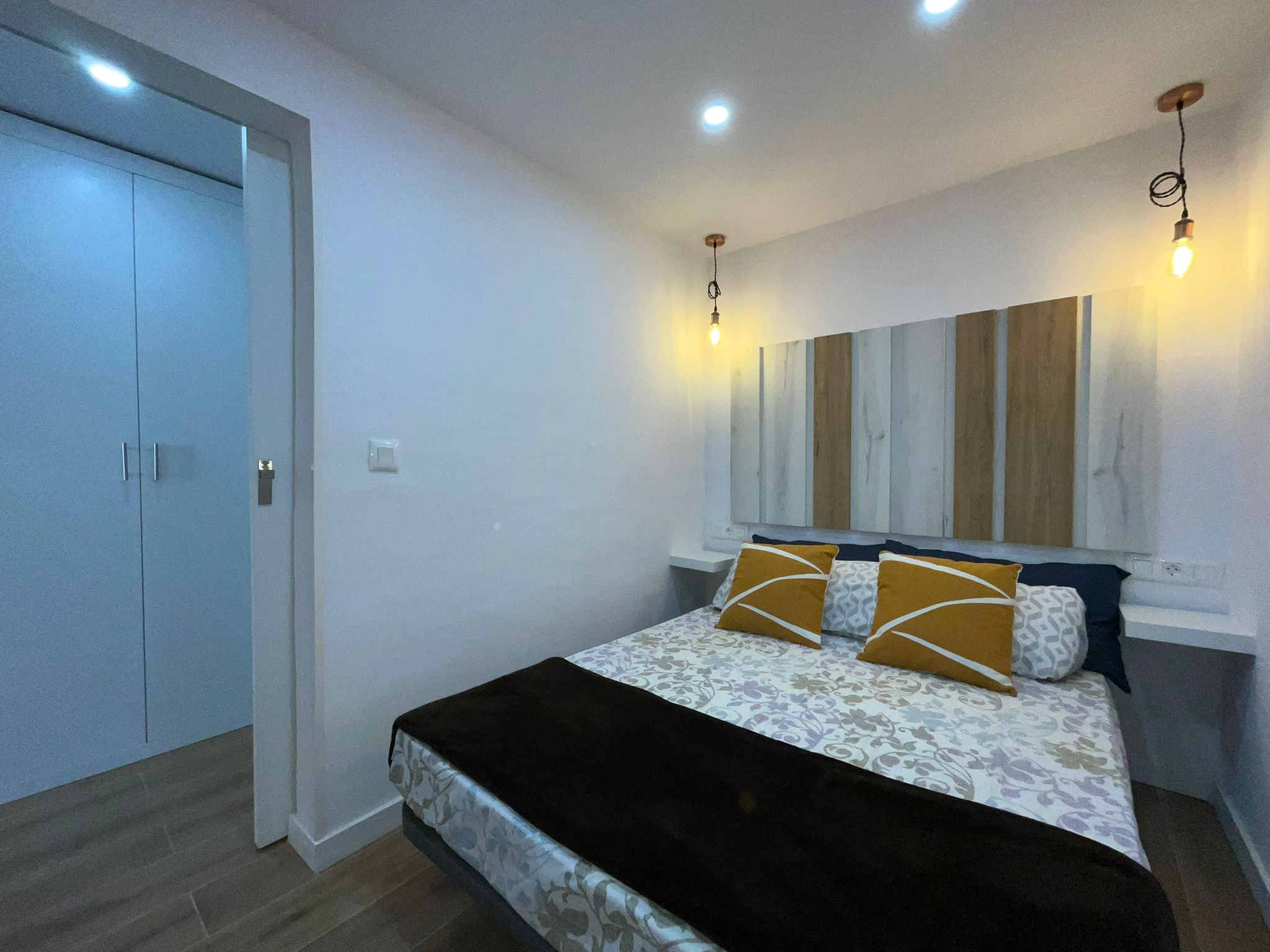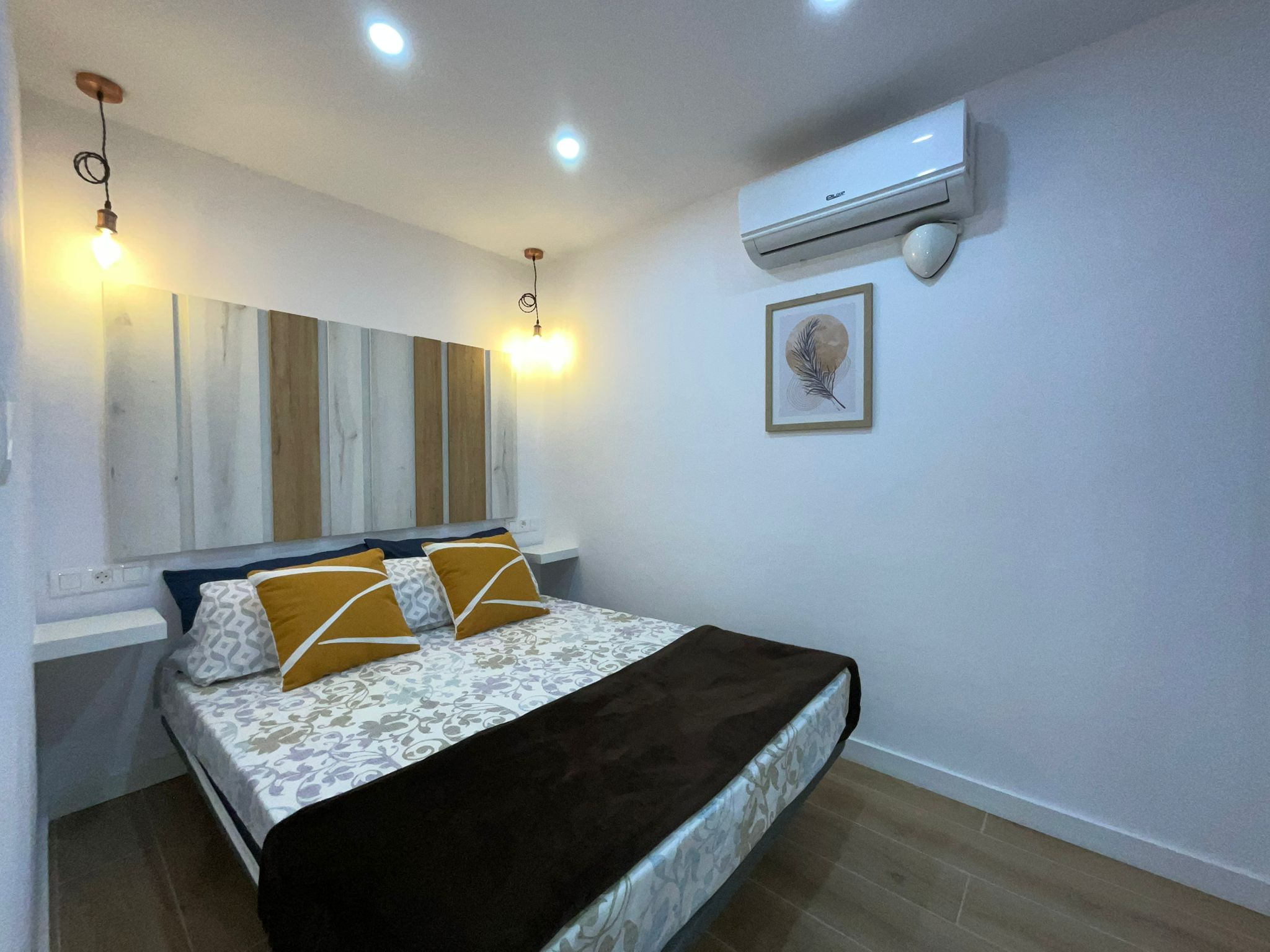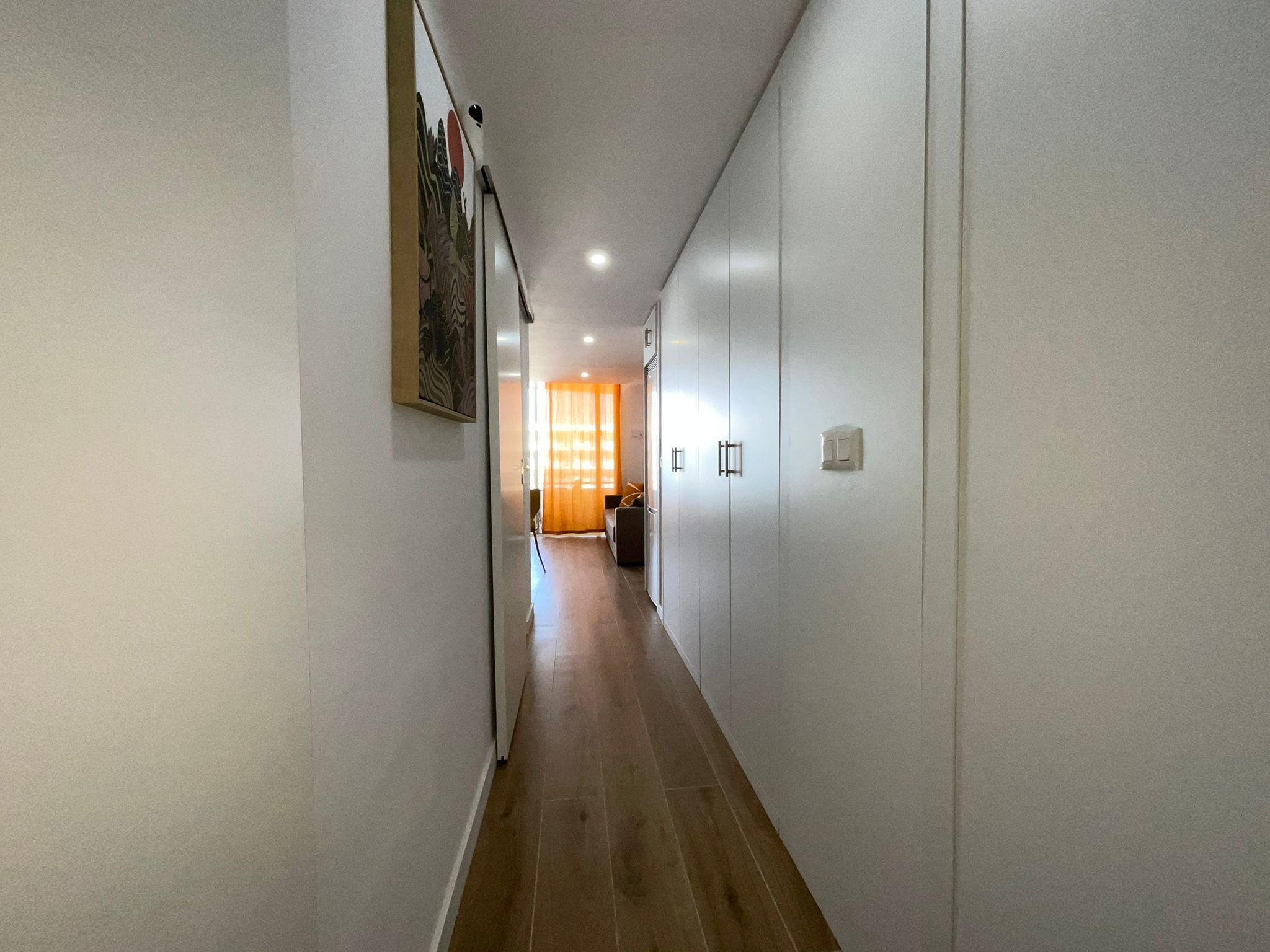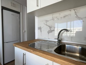The recently renovated bathroom stands out for its elegant and functional design, with a spacious shower, washbasin with LED mirror and high-quality finishes. In addition, the property includes a washing machine, concealed water heater and built-in storage spaces.