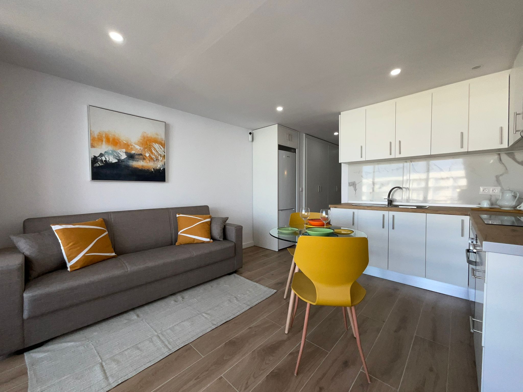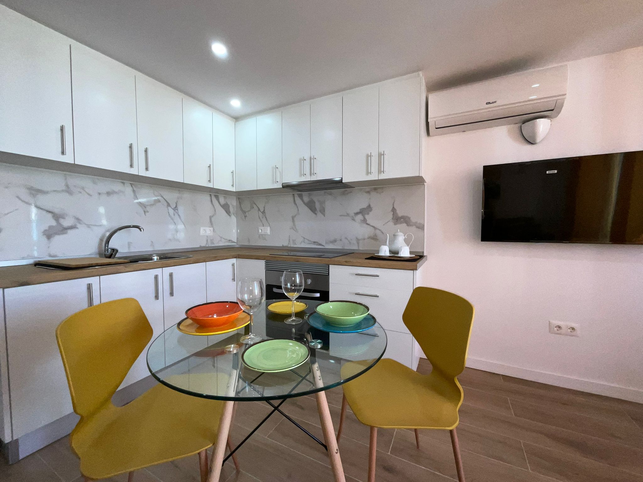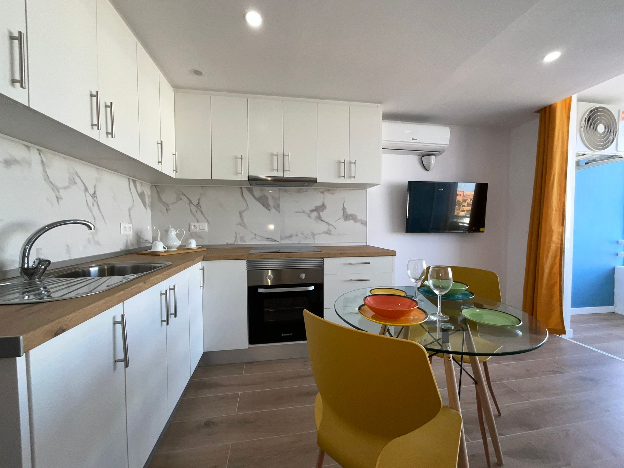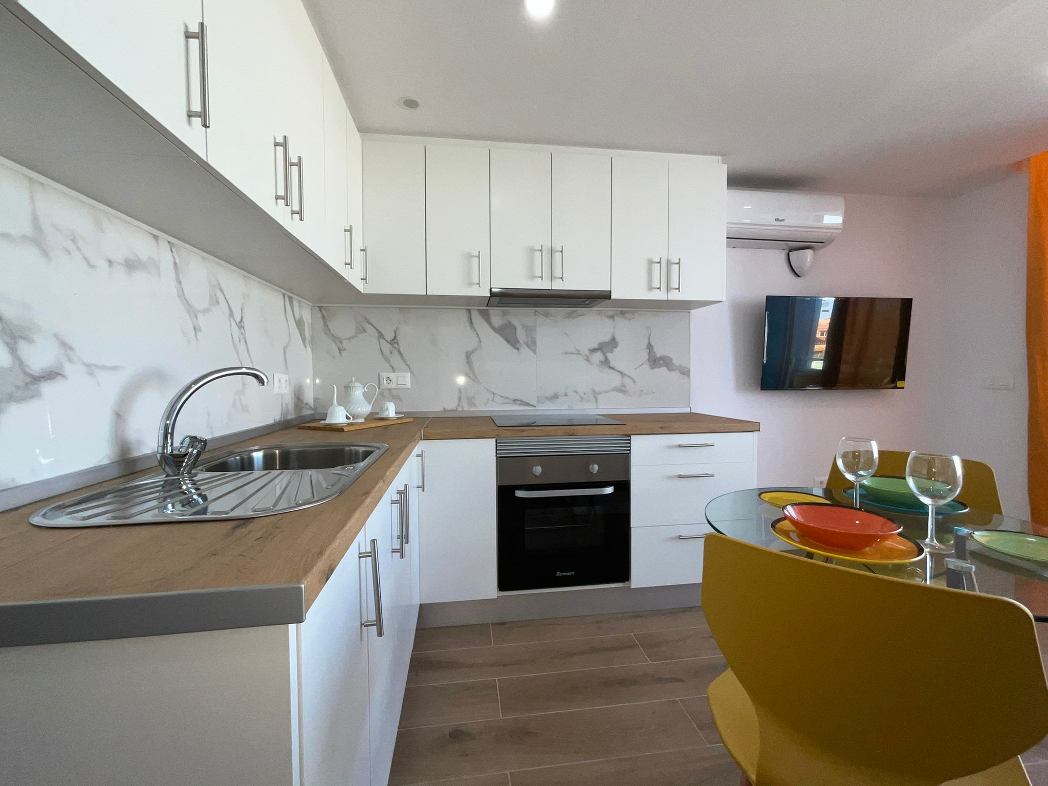 The open-plan kitchen, integrated into the living room, has a modern and functional design, accompanied by a table with matching chairs, perfect for everyday use or for entertaining guests. The cosy and comfortable living room is furnished with a sofa bed and television, creating an ideal space to relax.