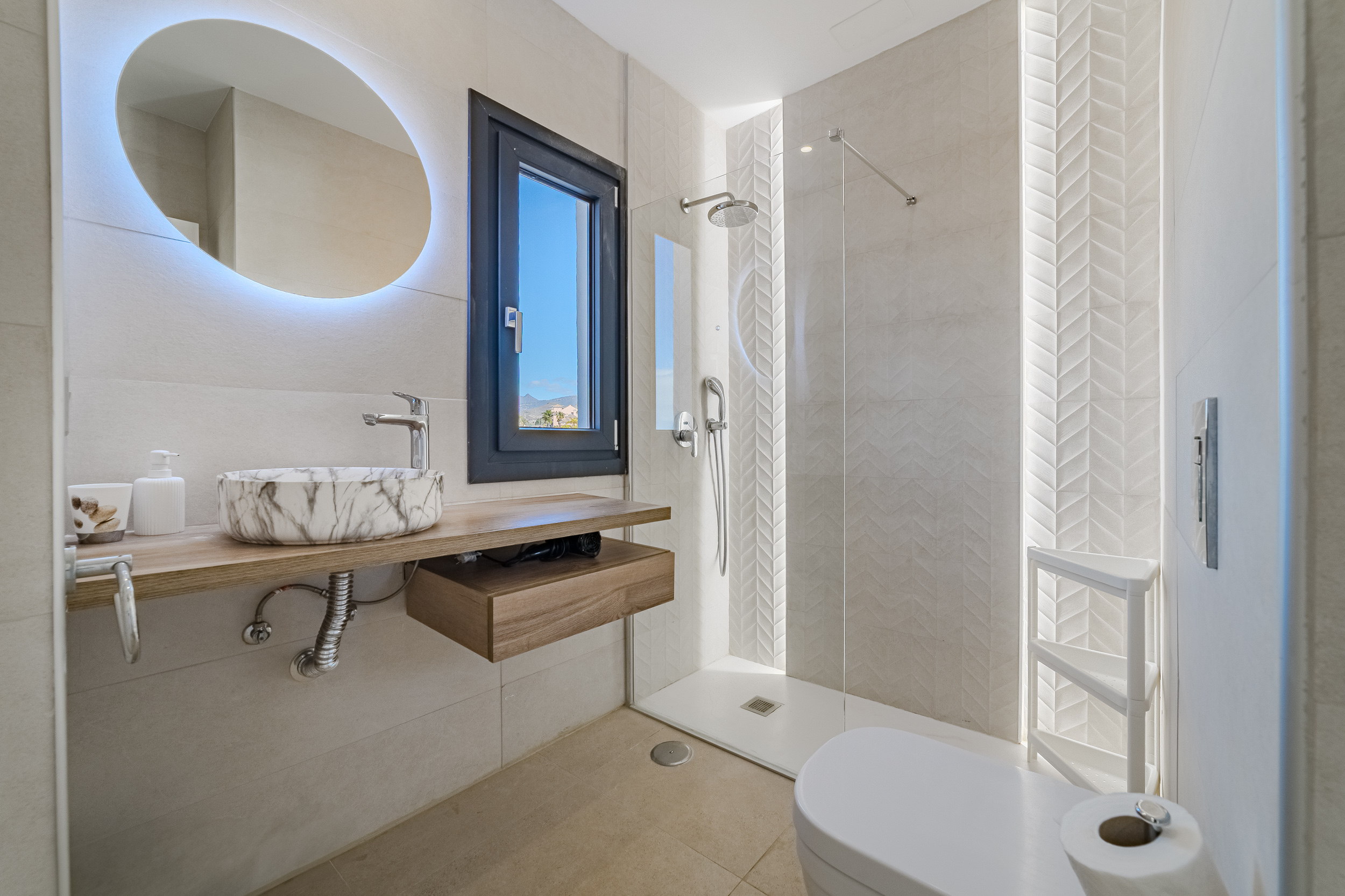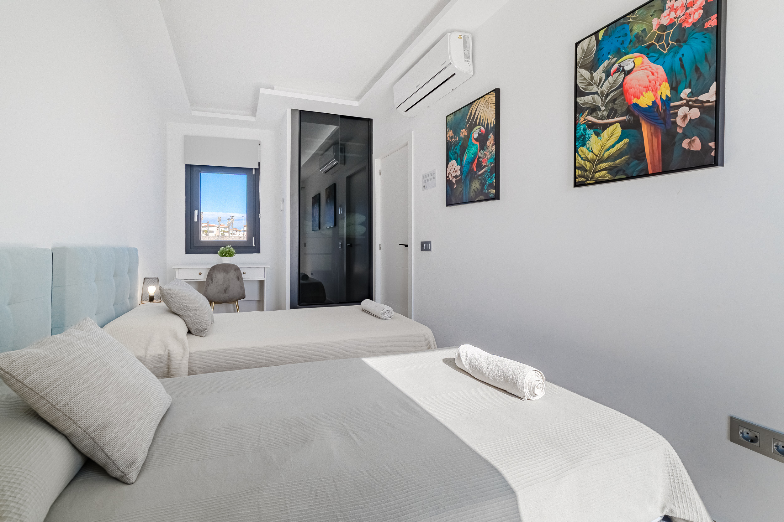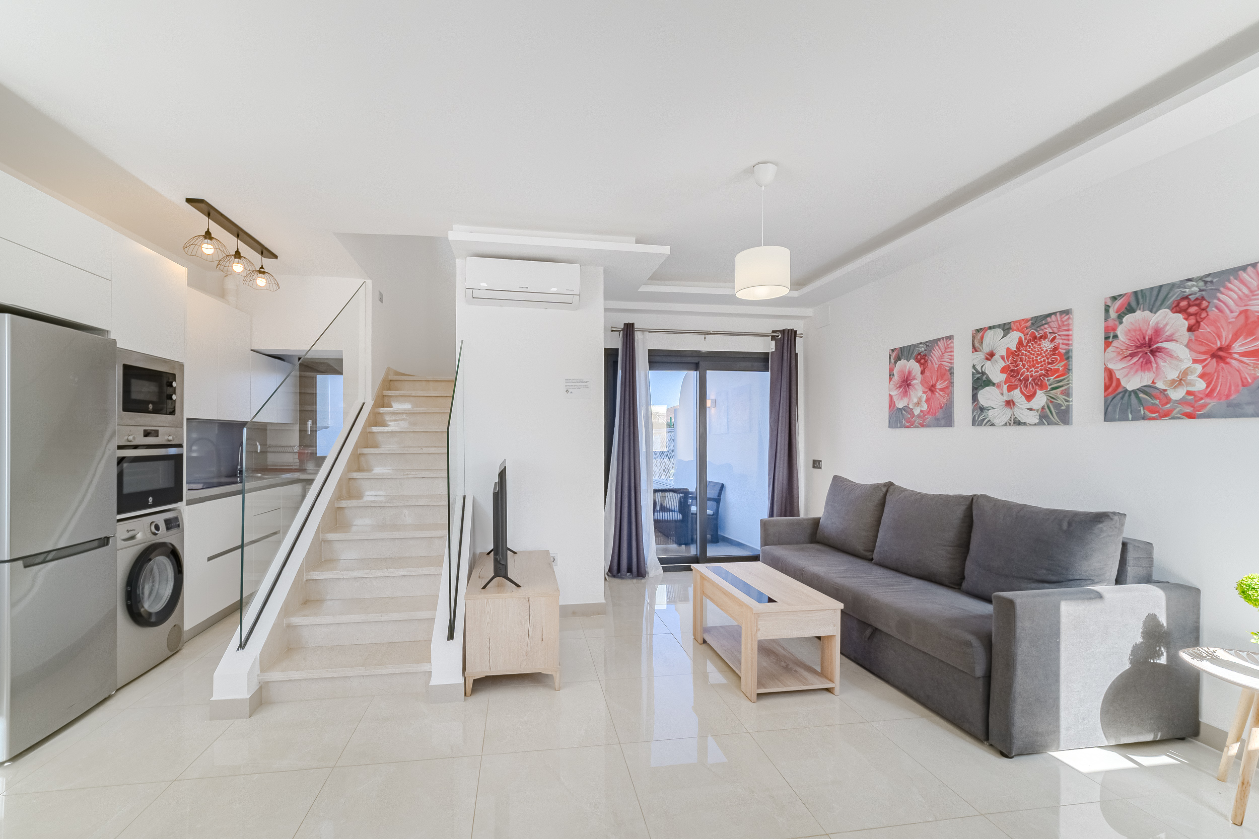 Upstairs, you will find two double bedrooms with fitted wardrobes, each sharing their own balcony overlooking the communal pool. The full bathroom is finished to a very high standard. With 126m² built, this property offers excellent value for money as an investment in a growing area close to San Miguel beach and marina.